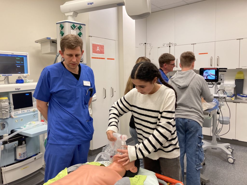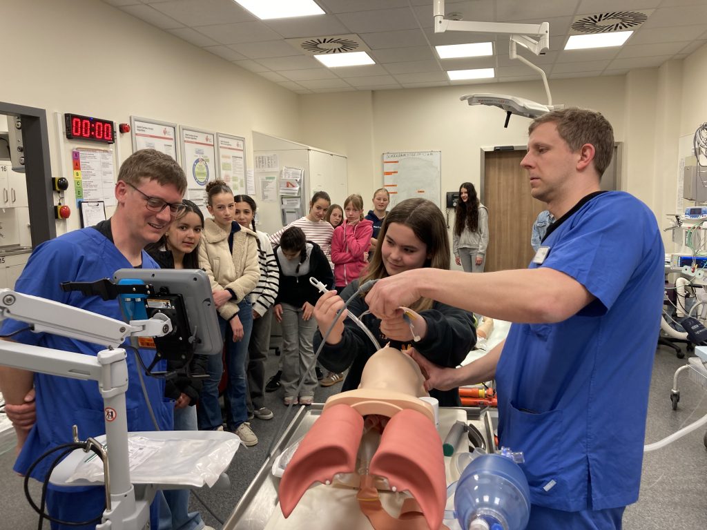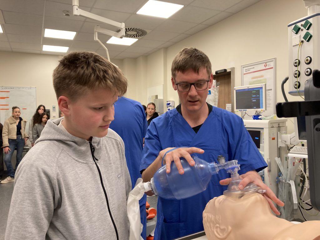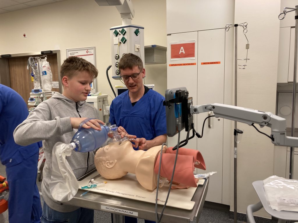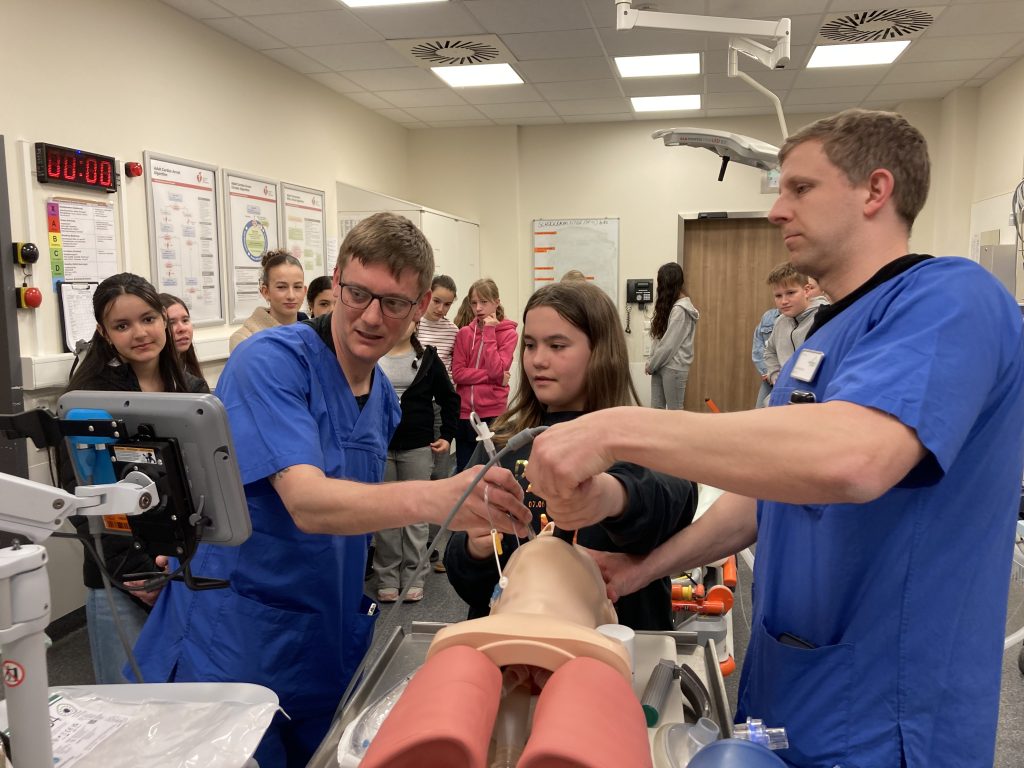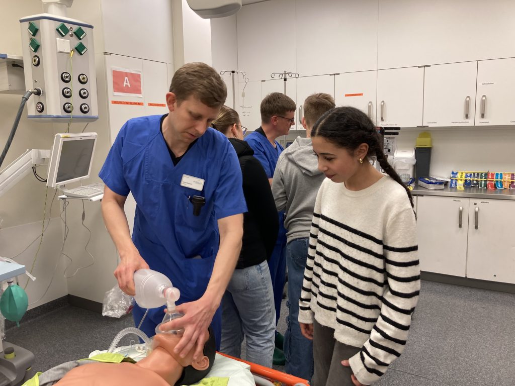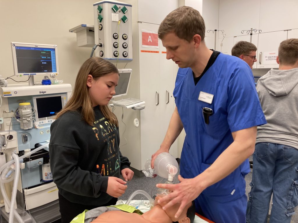 Die erste Station der Fünft- bis Zehntklässler erfolgte gleich am Puls der Klinik, nämlich in der Zentralen Notaufnahme, wo der Anästhesist und leitende Notarzt Daniel Bladowski sowie Christian Waas, von der Zentralen Anästhesie, die zunächst noch schüchternen Gäste in die Geheimnisse der Notfallmedizin einweihen.