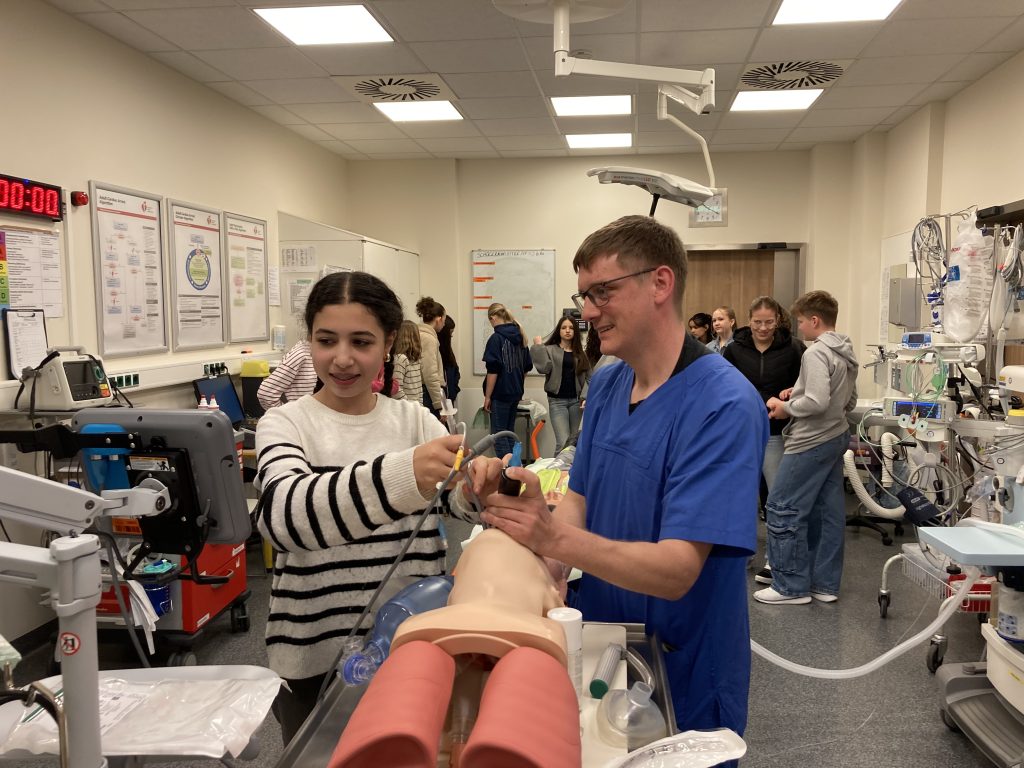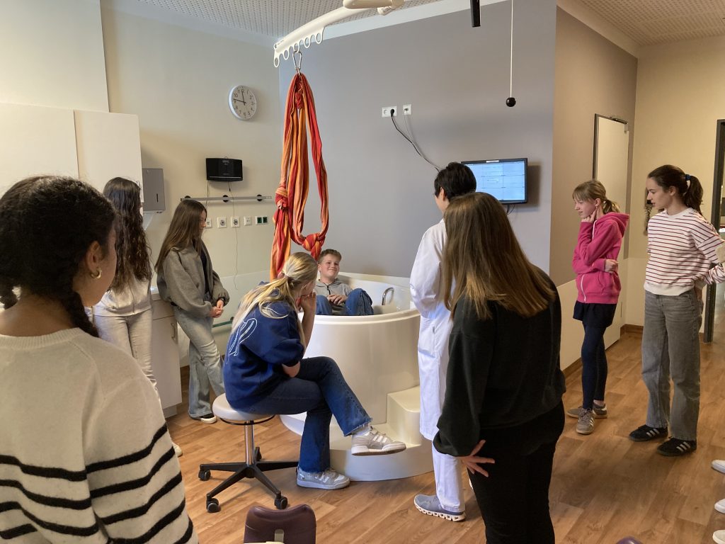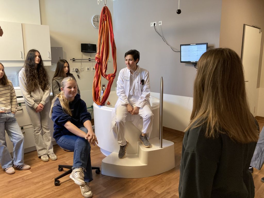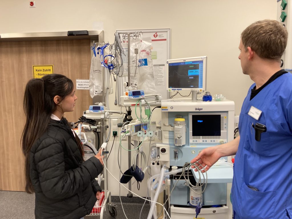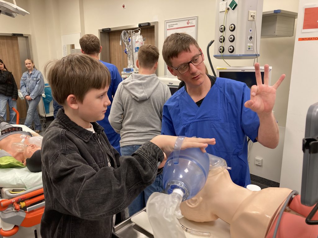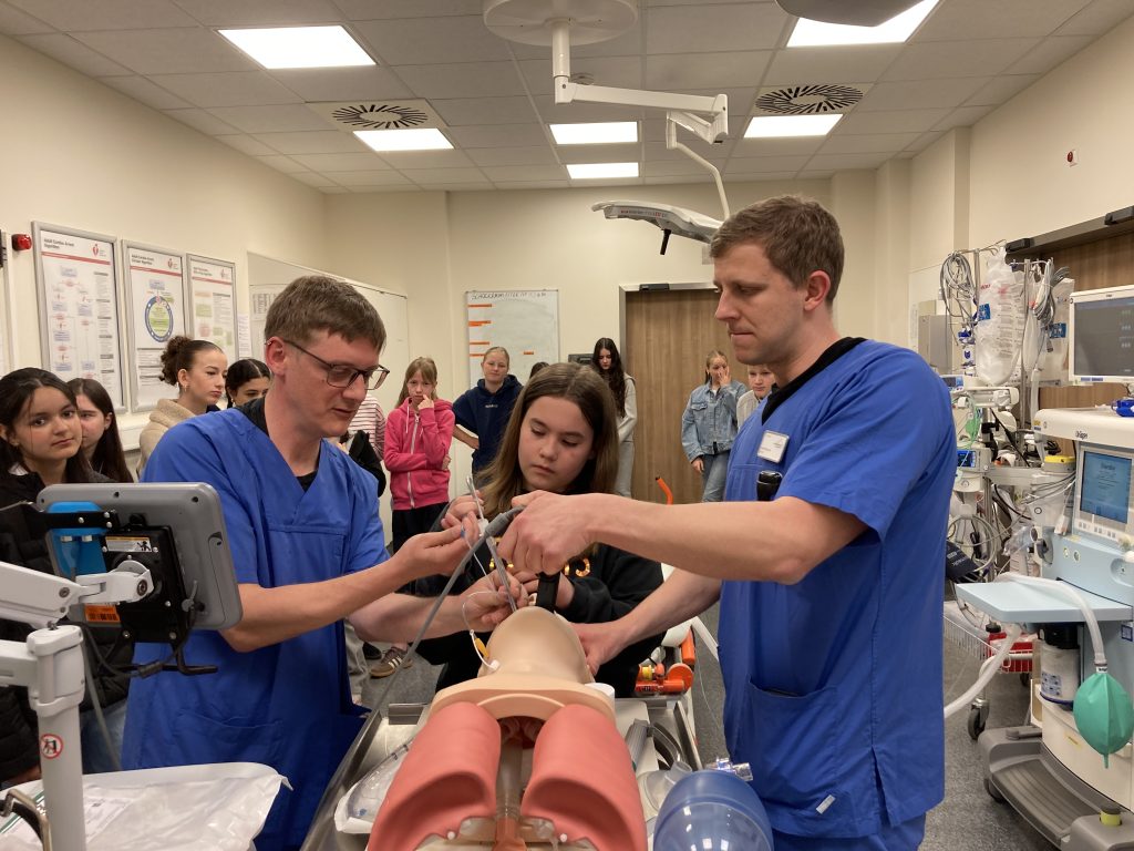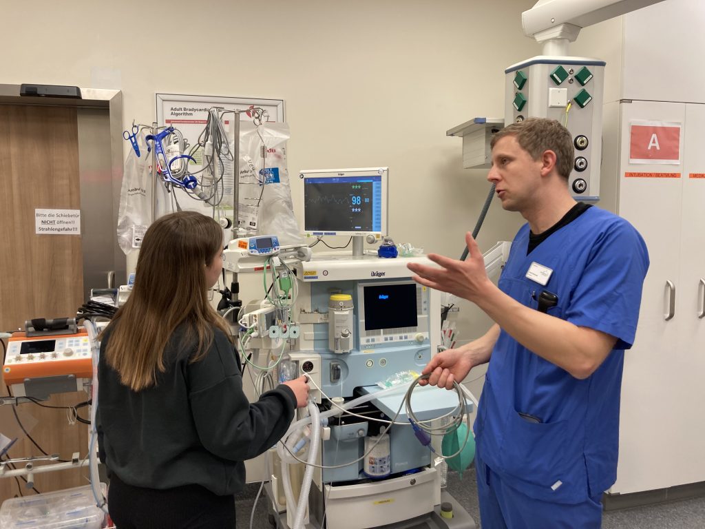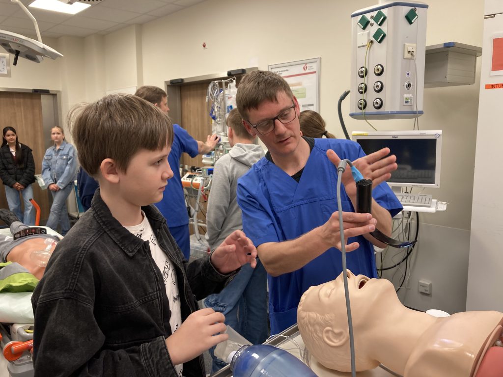Die erste Station der Fünft- bis Zehntklässler erfolgte gleich am Puls der Klinik, nämlich in der Zentralen Notaufnahme, wo der Anästhesist und leitende Notarzt Daniel Bladowski sowie Christian Waas, von der Zentralen Anästhesie, die zunächst noch schüchternen Gäste in die Geheimnisse der Notfallmedizin einweihen.