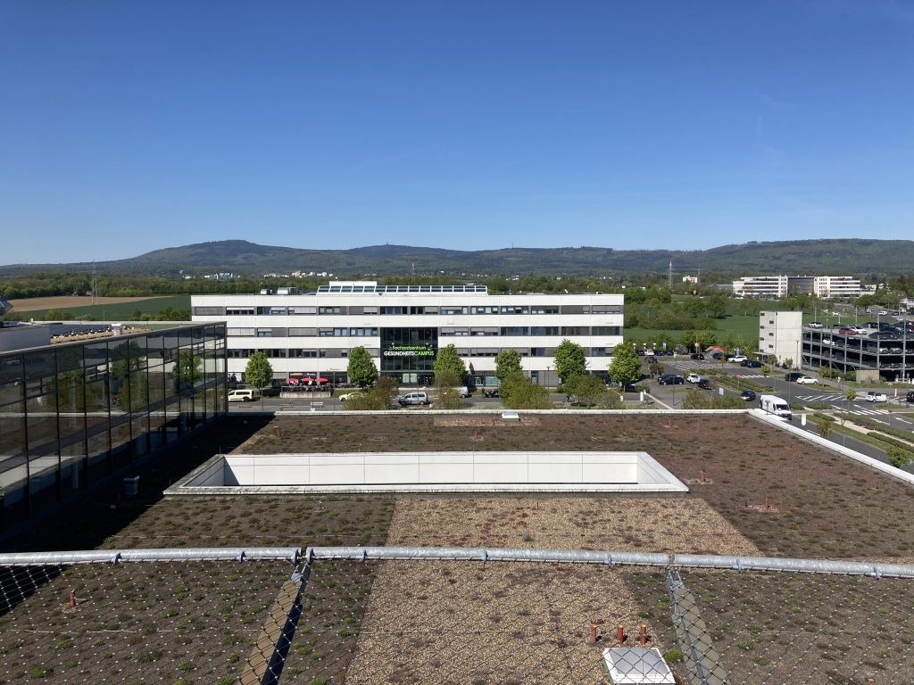 Der Gesundheitscampus aus der Luft, und mitten drin das Medizinische Versorgungszentrum Taunus (MVZ). Vorne zum Schutz ein Gitter, damit es nicht zu Unfällen kommt.