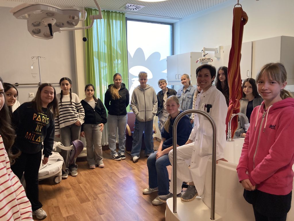 Willkommen im Kreißsaal bei Dr. med. Kanya Götsch, Leitende Oberärztin der Frauenklinik. Sprachlos sind die Kinder, als sie von der Ärztin erfahren, dass eine Geburt zwei, aber auch mal zwanzig Stunden dauern kann.